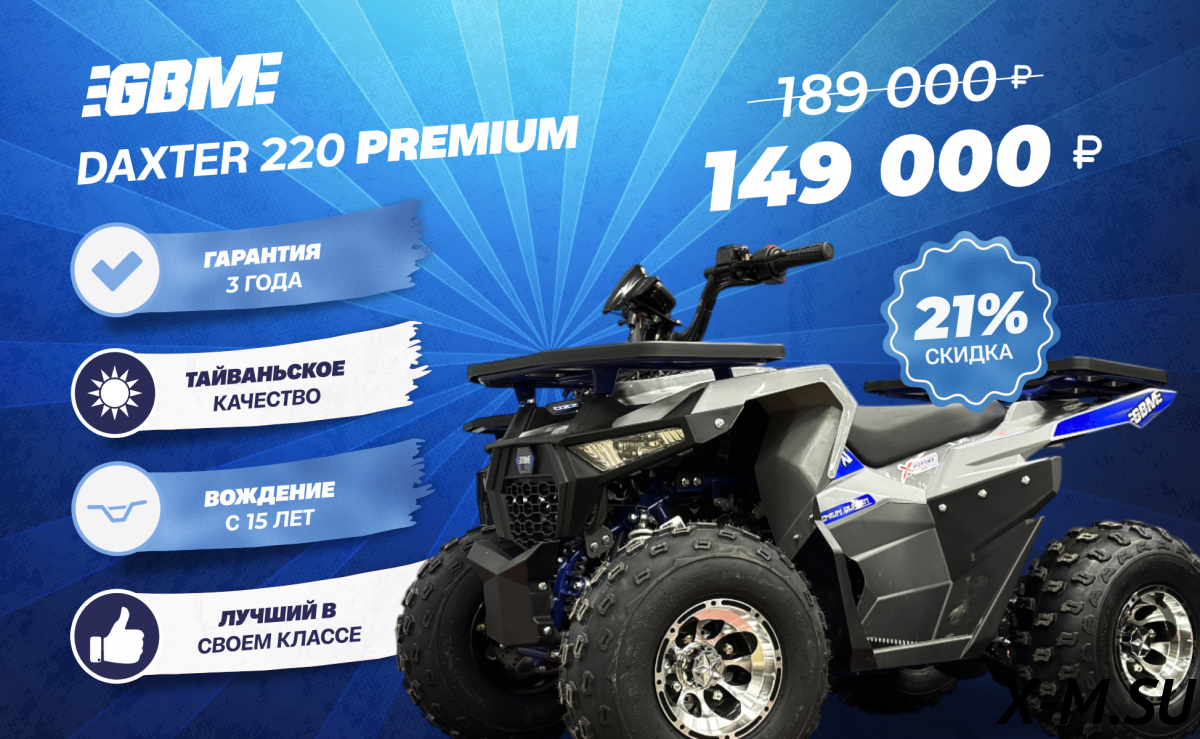 За свои бабки - топ! GBM DAXTER 220 NEW PREMIUM – отличный аппарат. Мощности хватает за глаза, по лесу просто песня. Пластик прочный, рама не гнётся. Тормоза отличные, ни разу не подвели. Единственное – инструкцию бы поподробней, а так всё отлично!